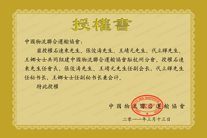 中国物流联合运输协会杭州分会授权书